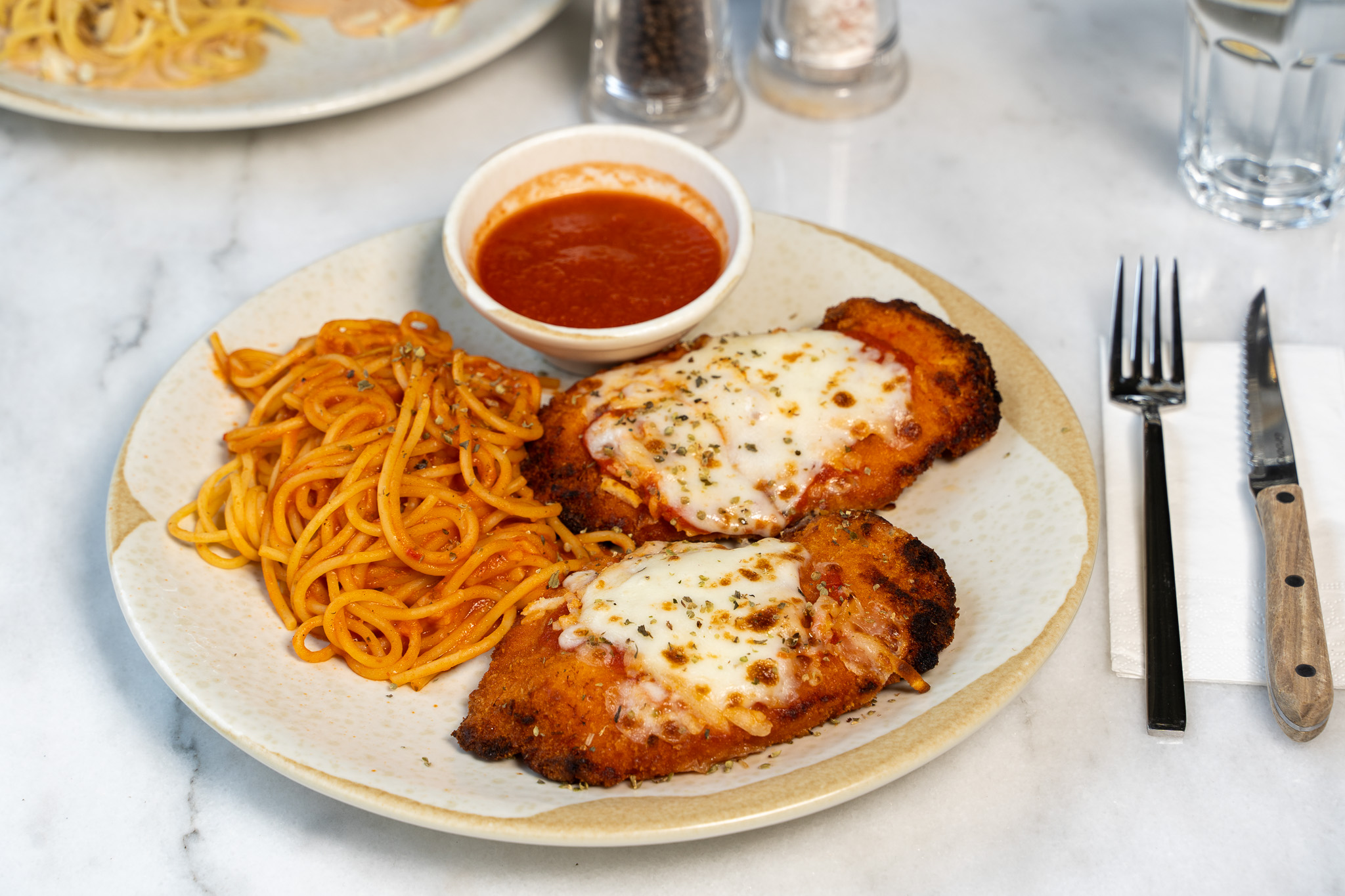 Kızartılmış çıtır tavuk üzerine napolitan sos, Parmesan peyniri ve Mozzarella peyniri yanında kremalı napolitan sosla harmanlanmış spagetti