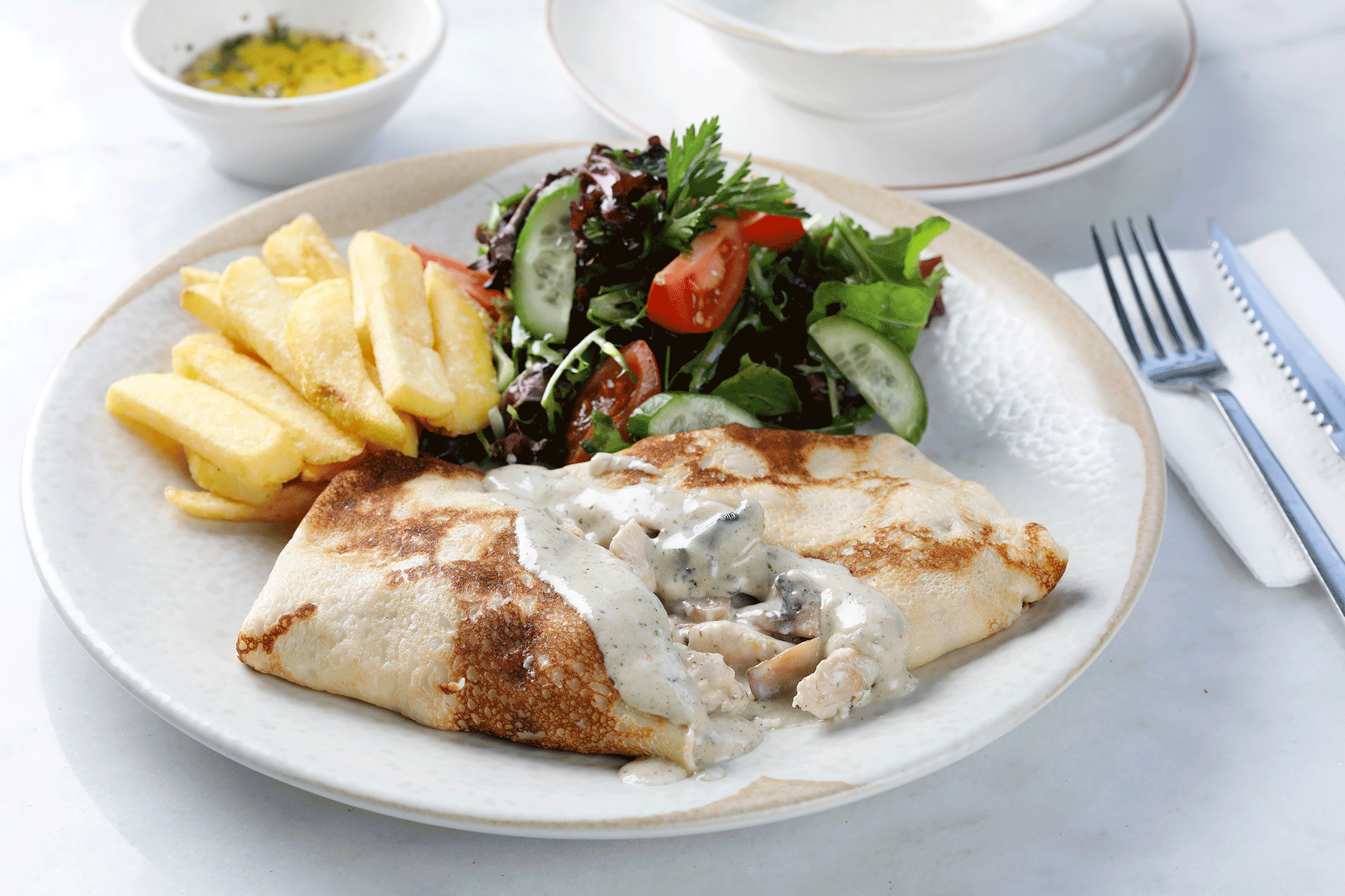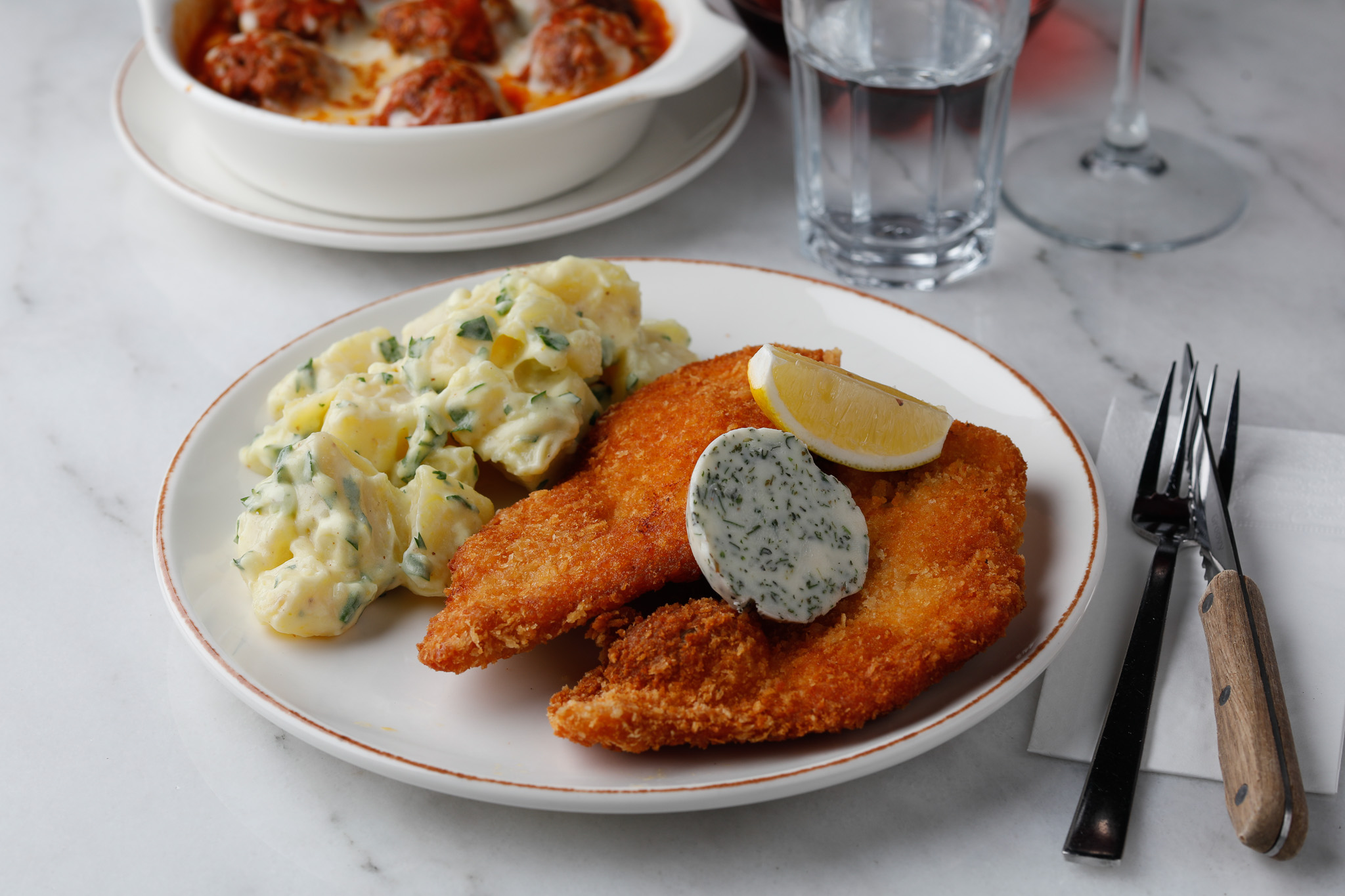 Kızartılmış çıtır tavuk üzerine taze otlu tereyağı yanında patates salatası ile birlikte