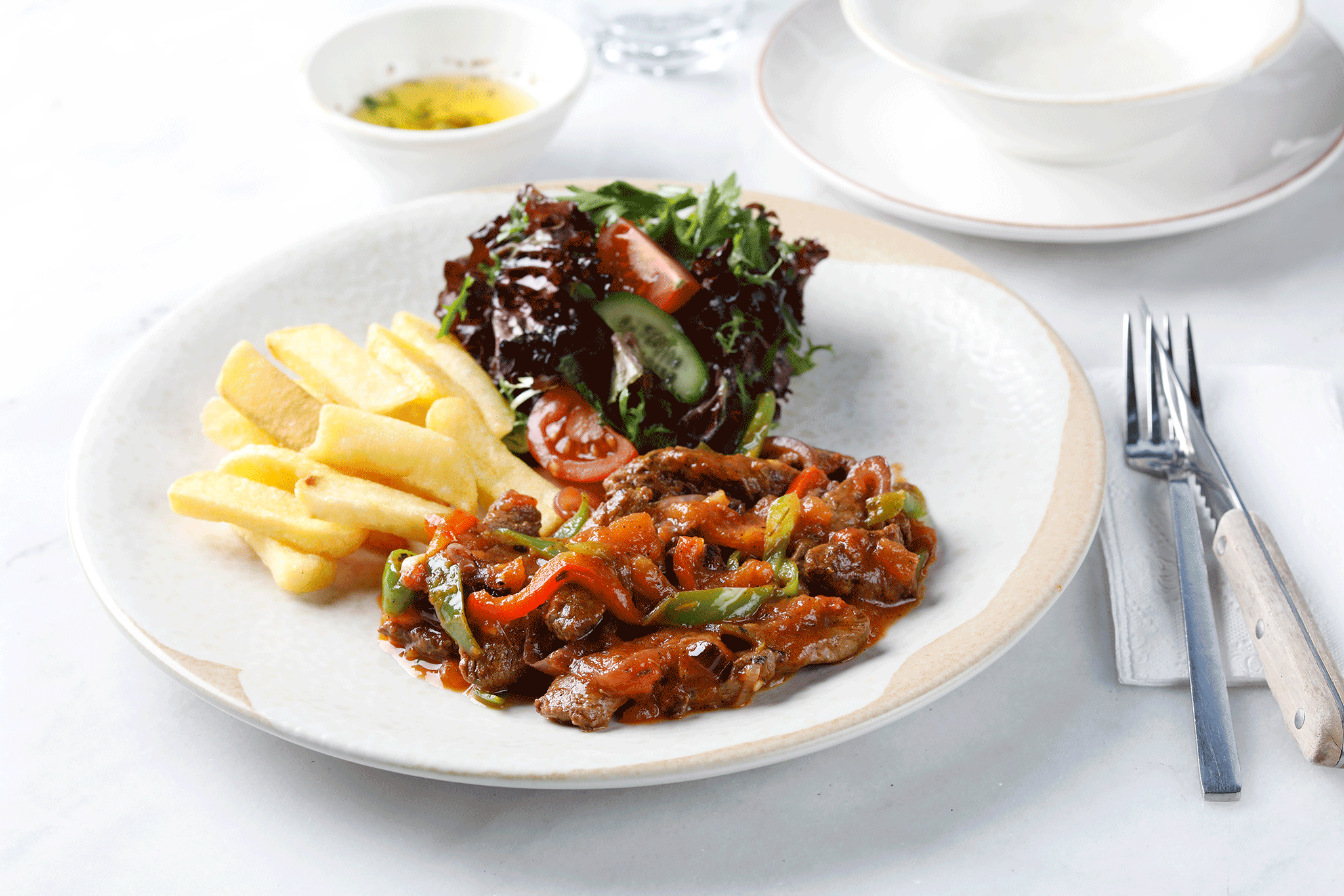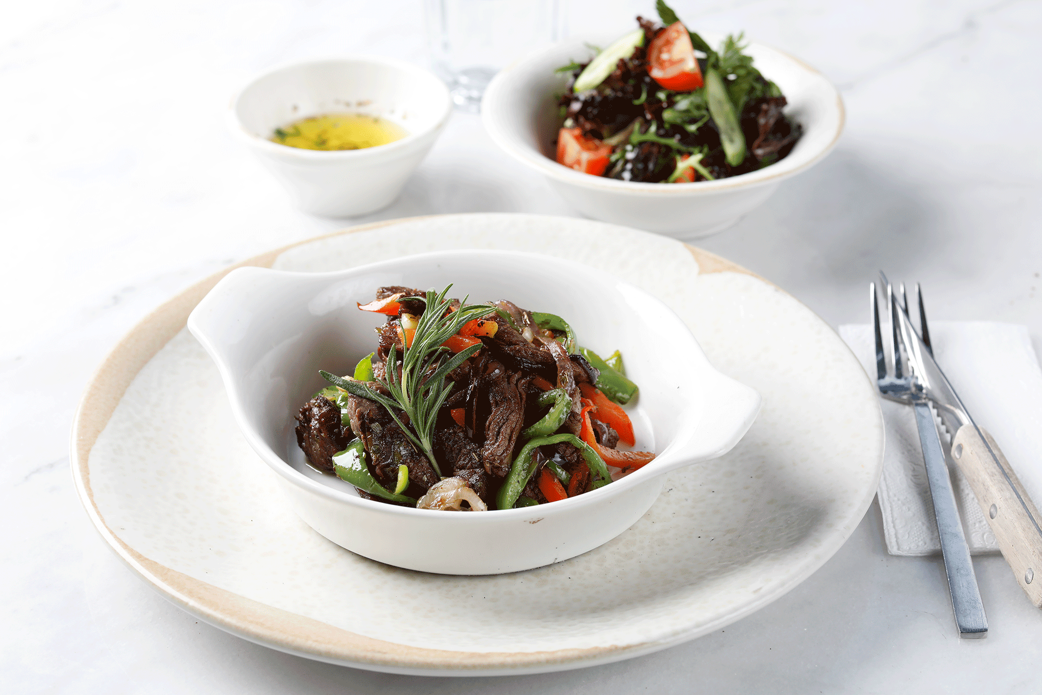 Renkli biberler,kırmızı soğan,tereyağ ve çeşitli baharatlar ile harmanlanmış jülyen bonfile dilimleri. Salata eşliğinde.