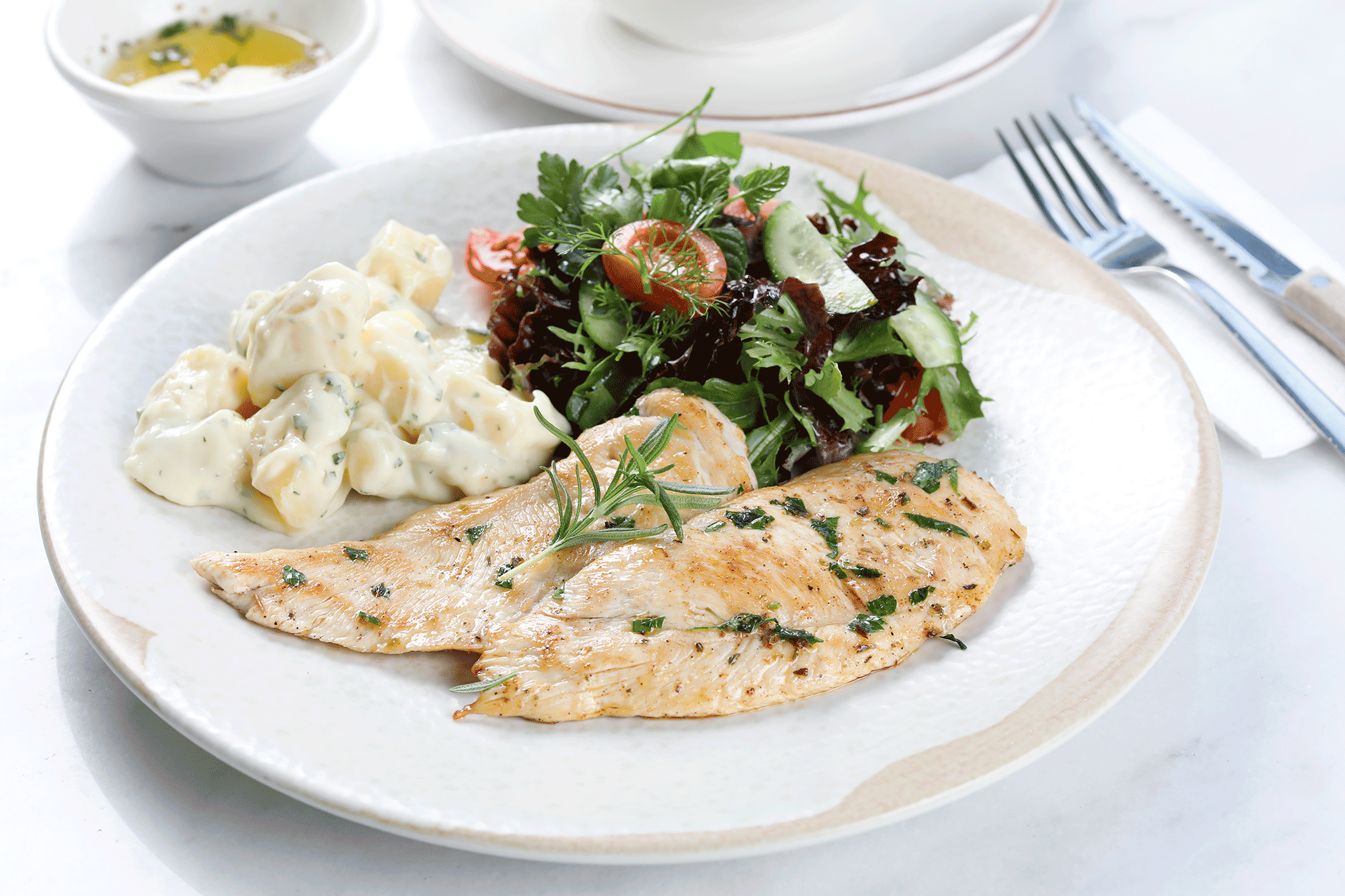 Tereyağ ve baharatlar ile harmanlanmış 2 adet ızgara tavuk fileto. Yanında salata ve patates salatası ile.
