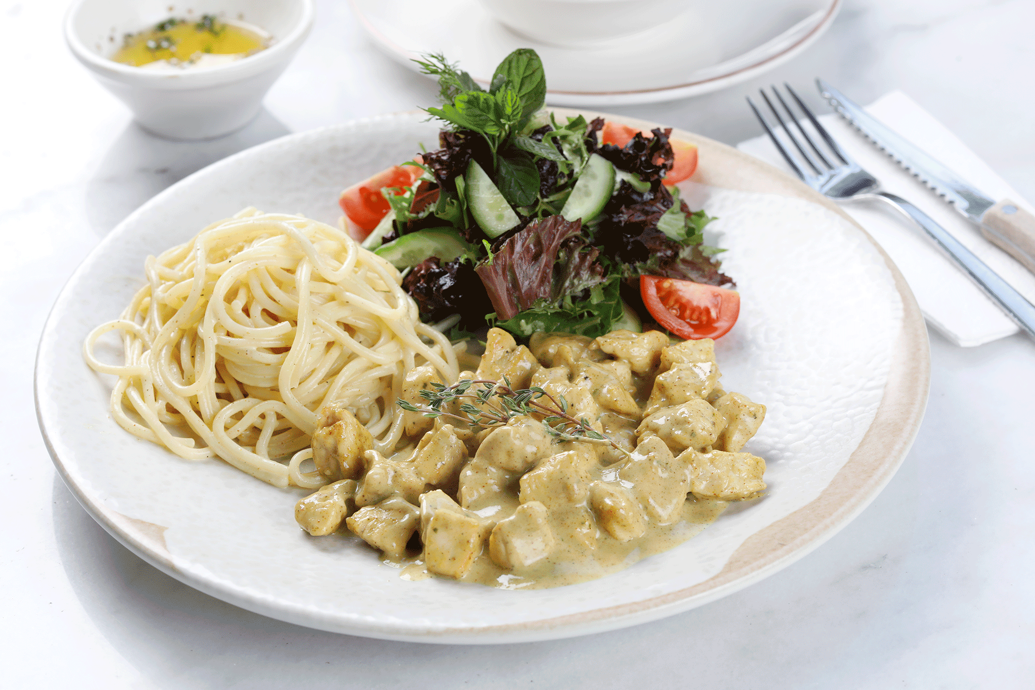 Küp doğranmış tavuk göğsü, krema,parmesan ve köri . Yanında kendi sosuyla harmanlanmış makarna ve salata