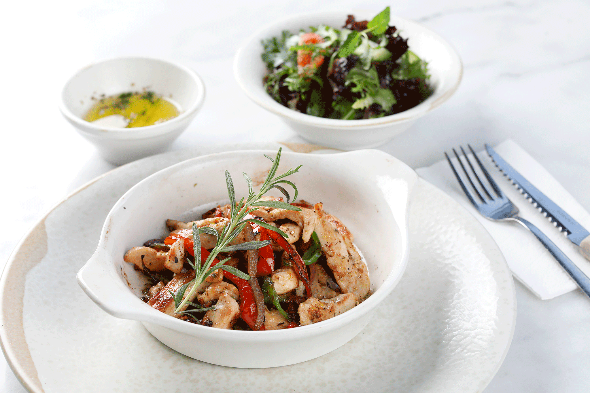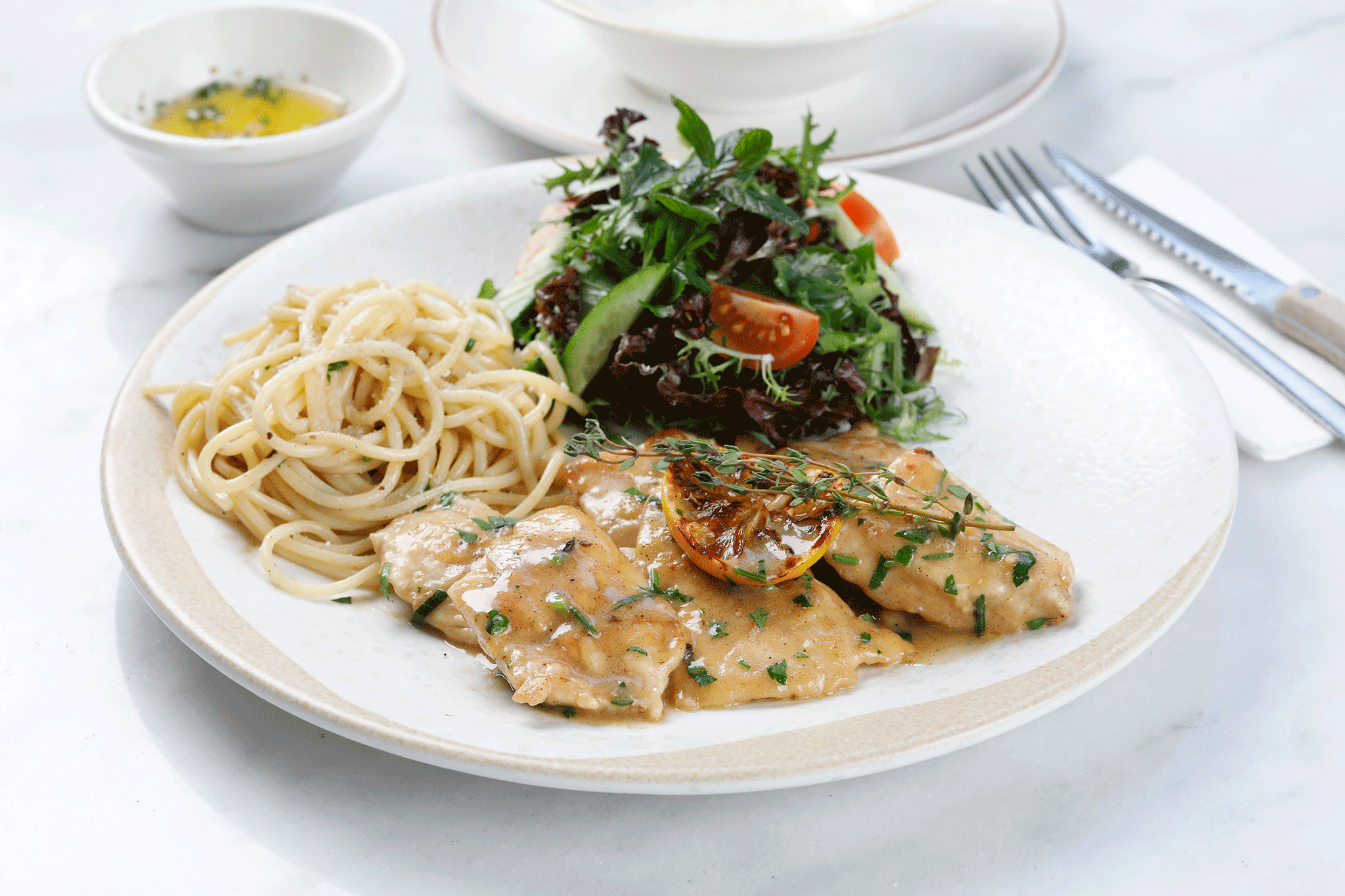 Taze sıkılmış limon suyu,taze kekik,maydanoz ve tereyağ ile bağlanmış tavuk fileto dilimleri. Yanında kendi sosu ile harmanlanmış makarna ve salata ile