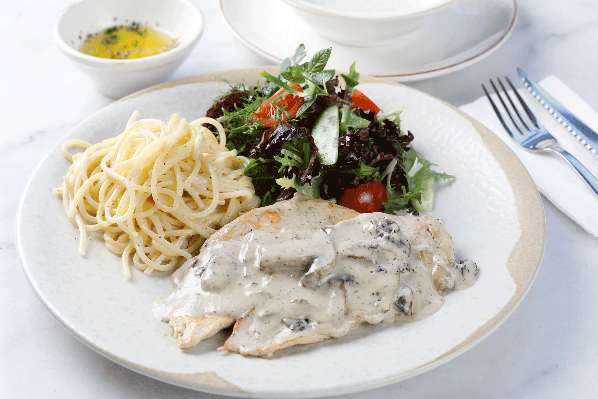 Mantar ve krema ile harmanlanmış 2 adet ızgara tavuk fileto. Yanında salata ve makarna ile