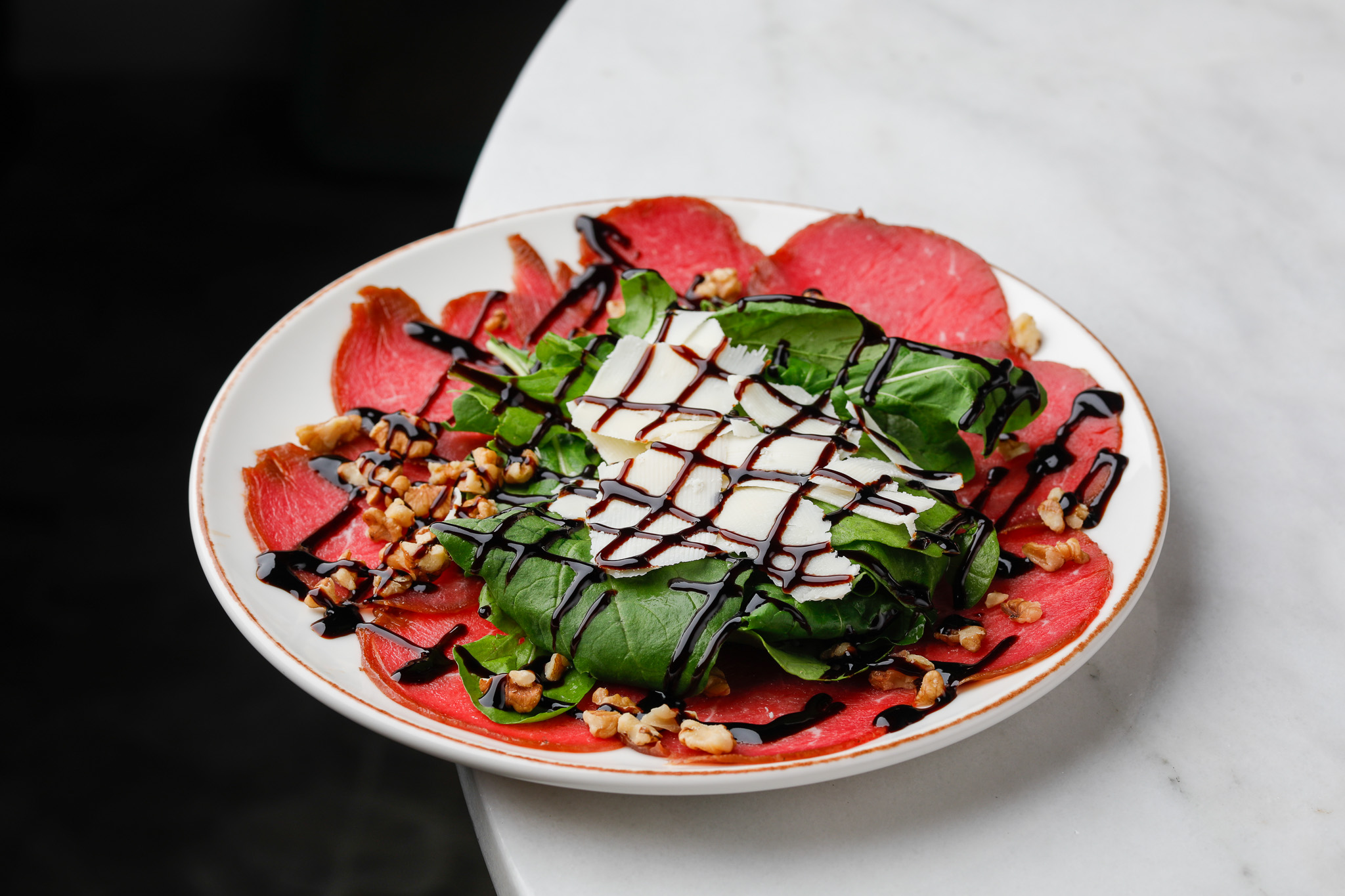 Asit ile pişirilmiş dana bonfile parçaları, parmesan peyniri, roka, ceviz vb. balzemik çektirmesi eşliğinde