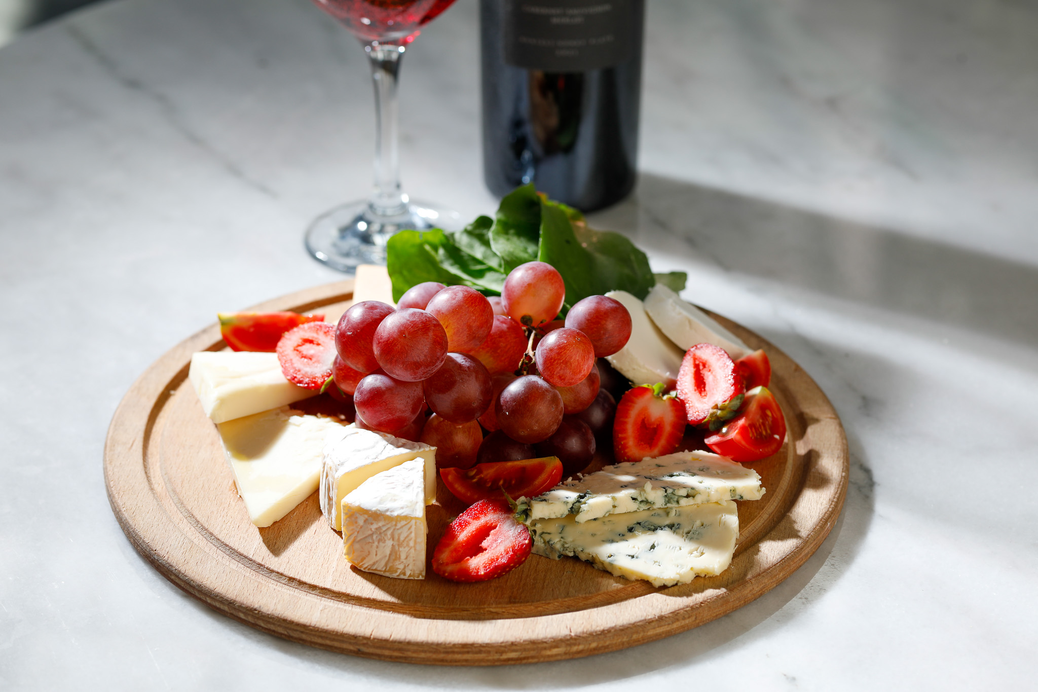 Rokfor peyniri, Parmesan peyniri, Brie peyniri, Edam peyniri, karamelize keçi peyniri ve eşlikçileriyle birlikte