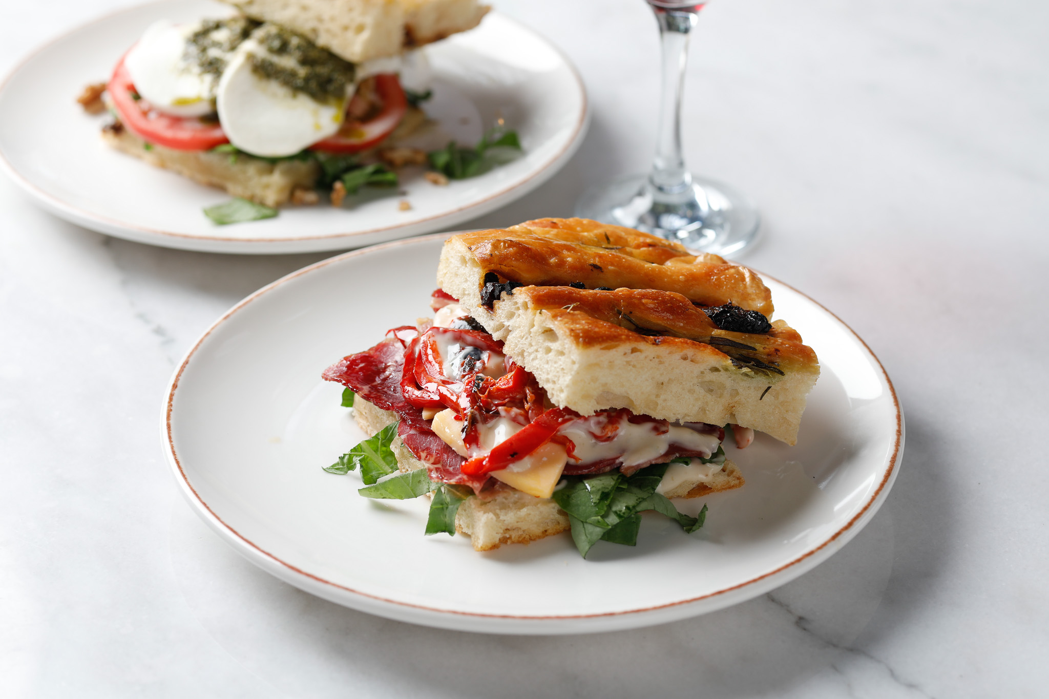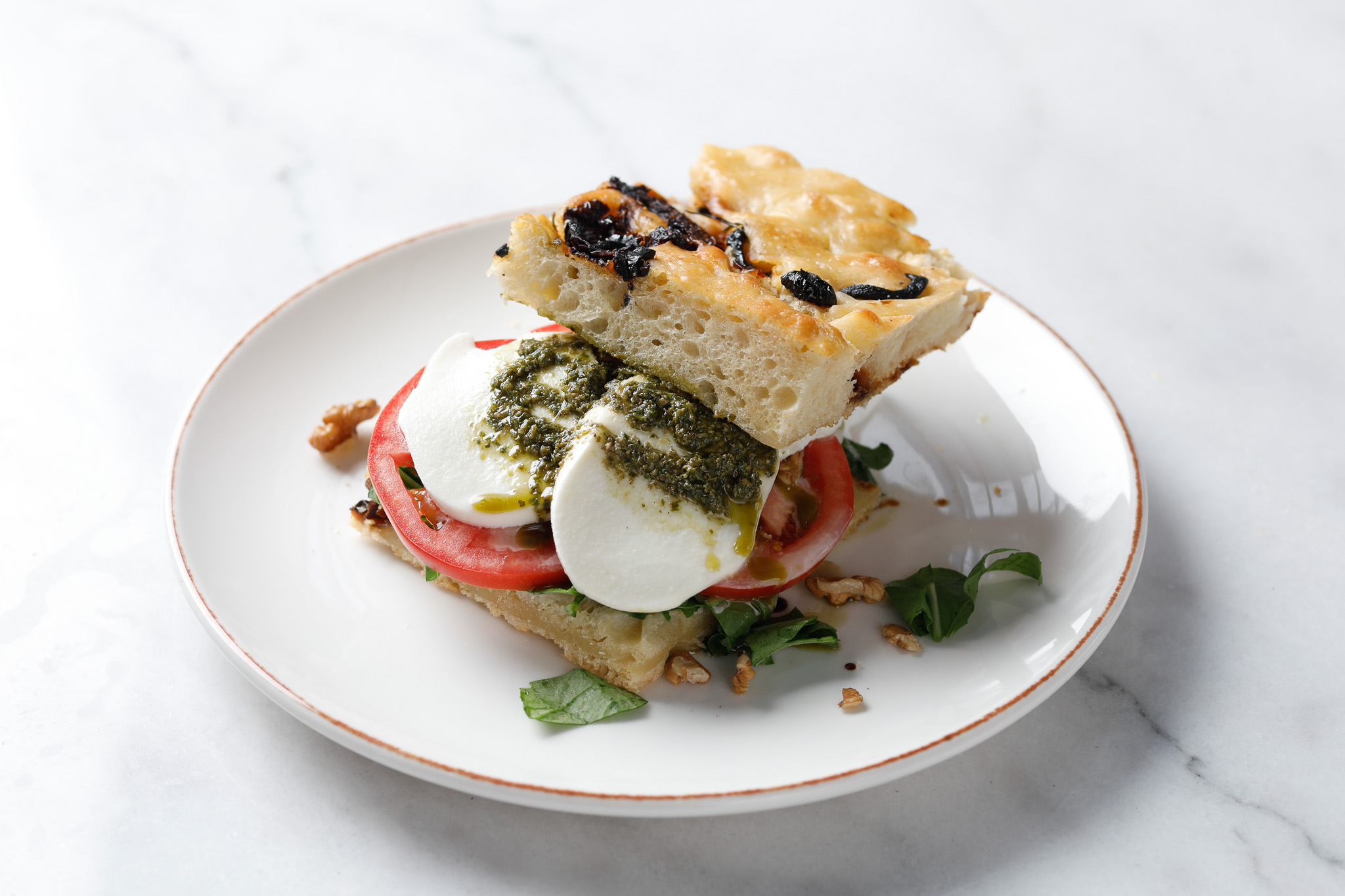 Mozzarella peyniri, roka, domates, pesto sos, ceviz, balzamik sirke ile yapılan soğuk sandviç