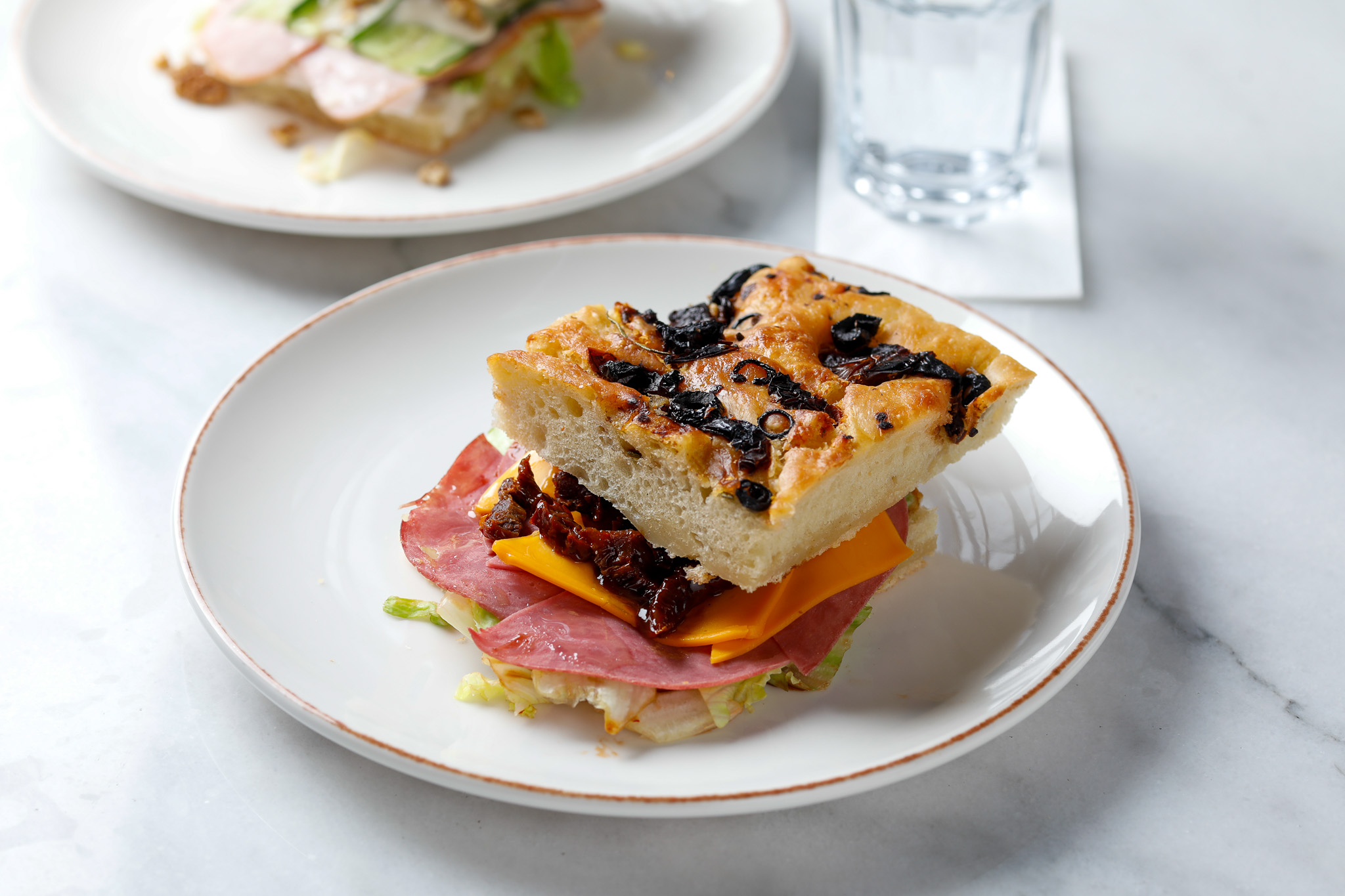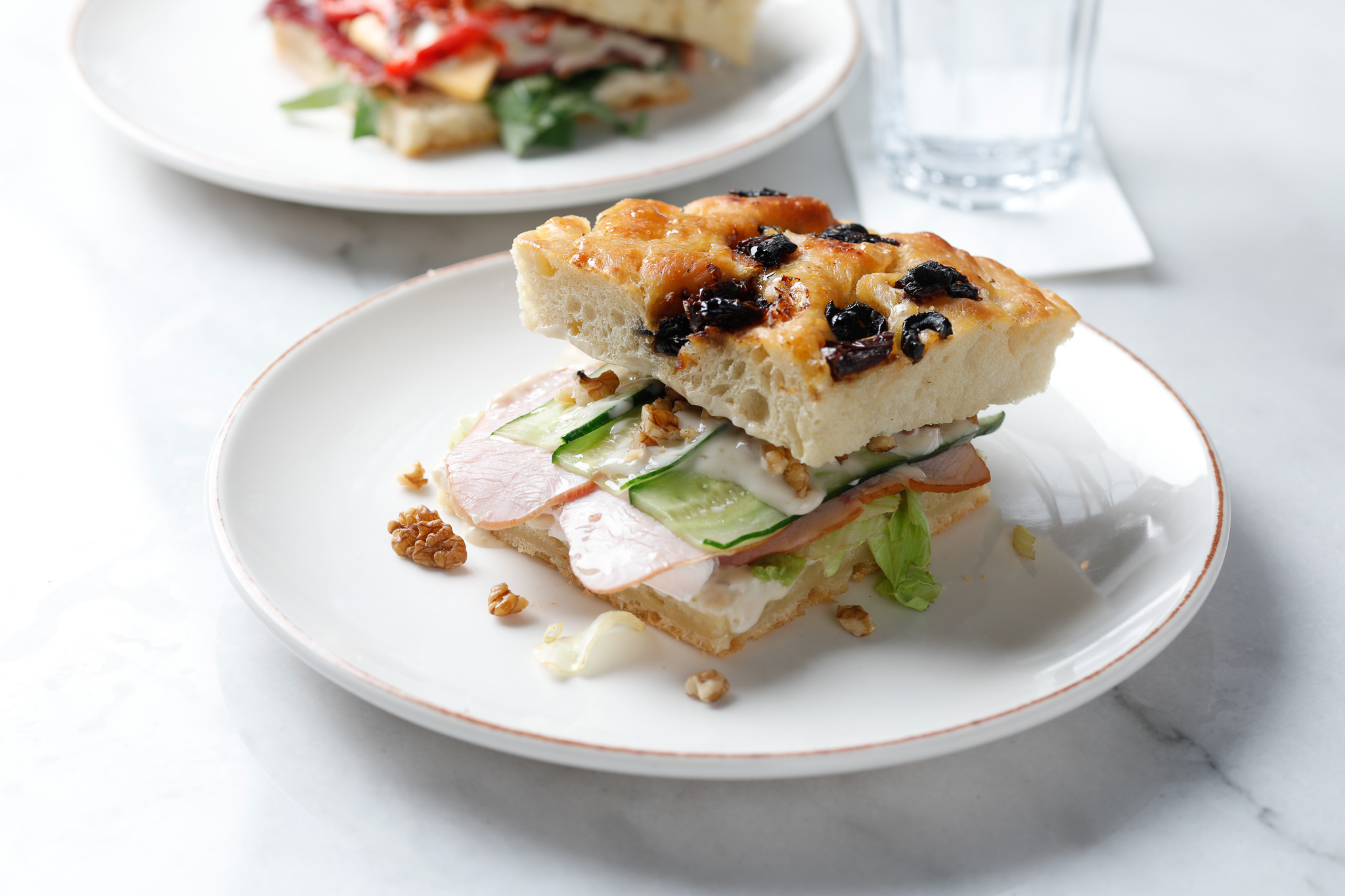 Dana jambon dilimleri, cheddar peyniri , iceberg marul, kurutulmuş domates ve ballı hardal sos ile yapılan soğuk sandviç