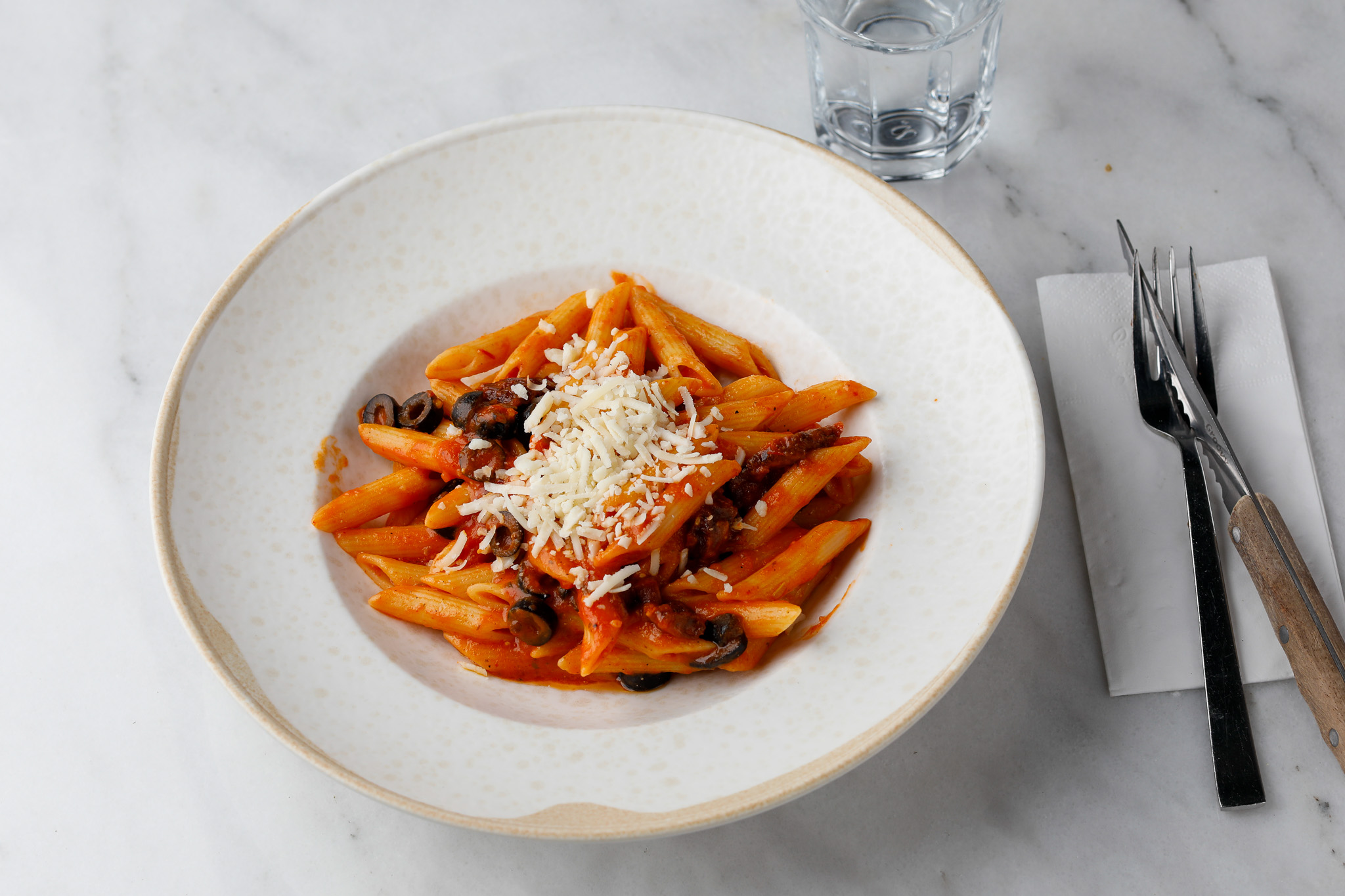 Kurutulmuş domates, acılı domates sosu, siyah zeytin ve Parmesan peyniri ile birlikte