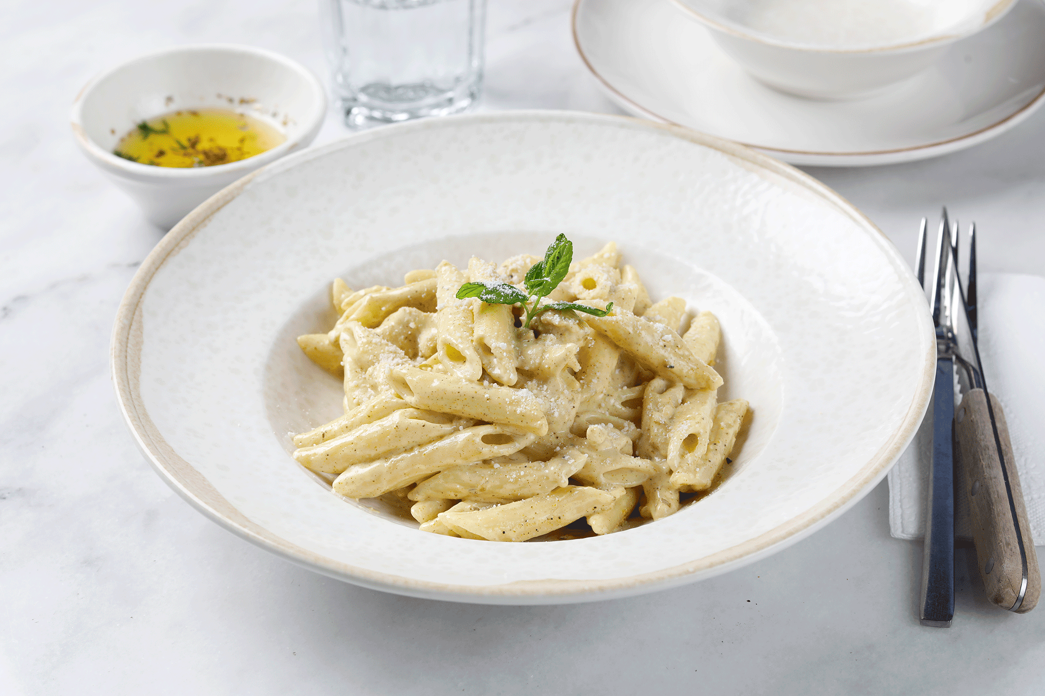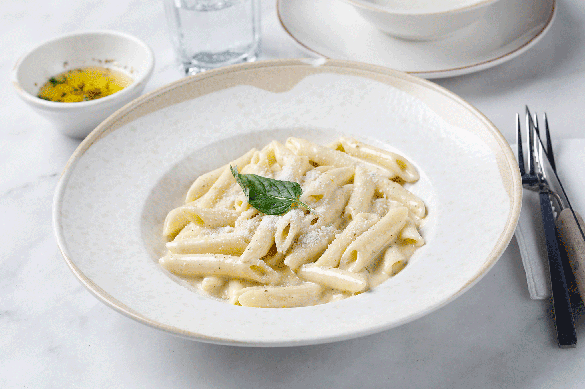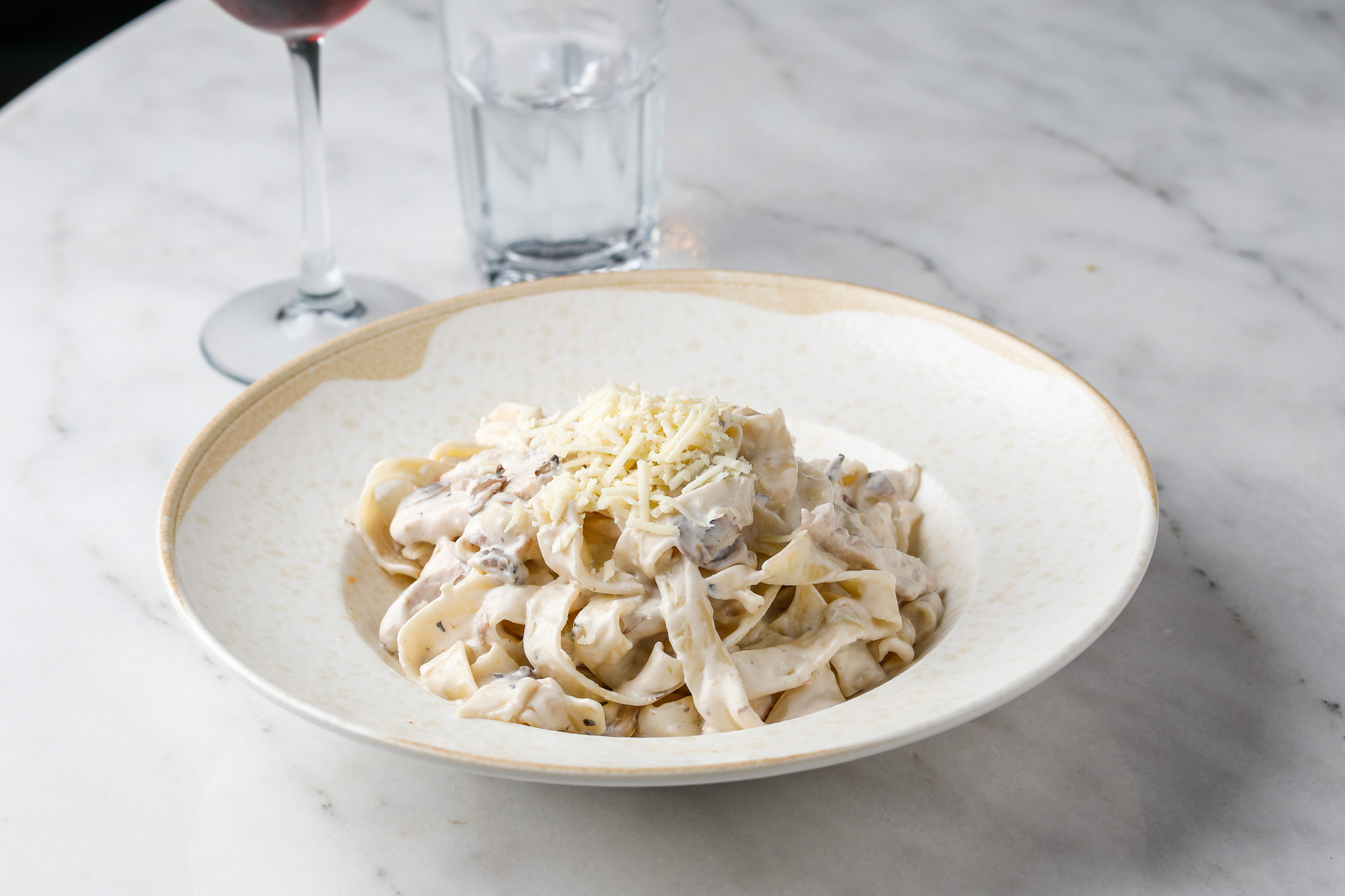 Sotelenmiş tavuk göğüs dilimleri, mantar, krema ve Parmesan peyniri