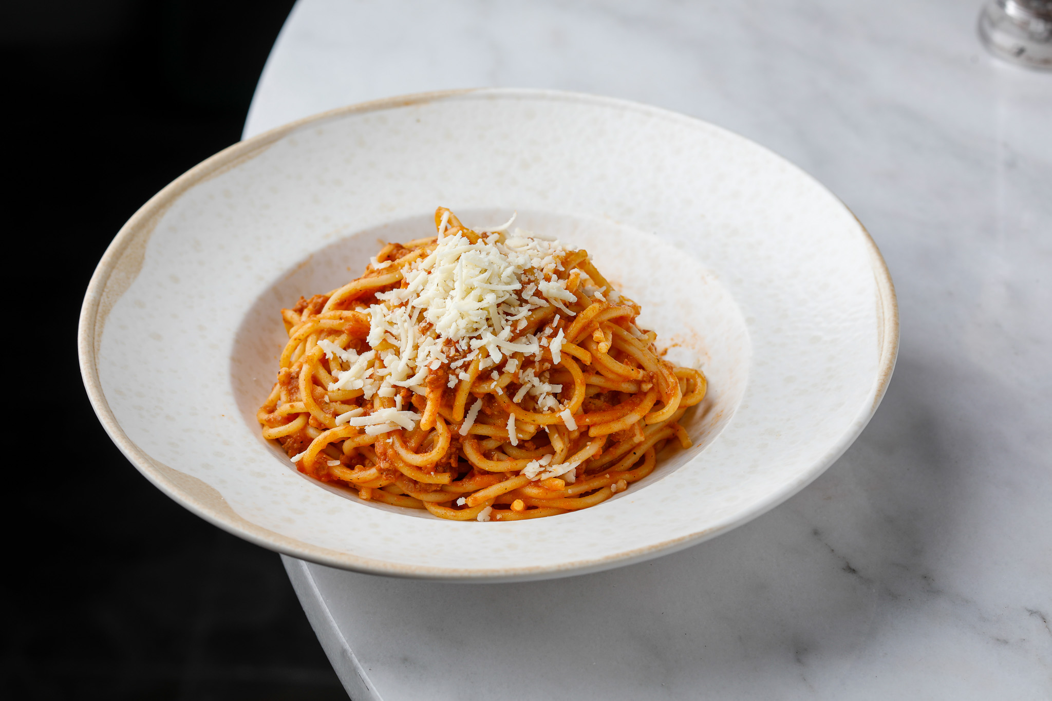 Bolonez sos ve Parmesan peyniri ile birlikte