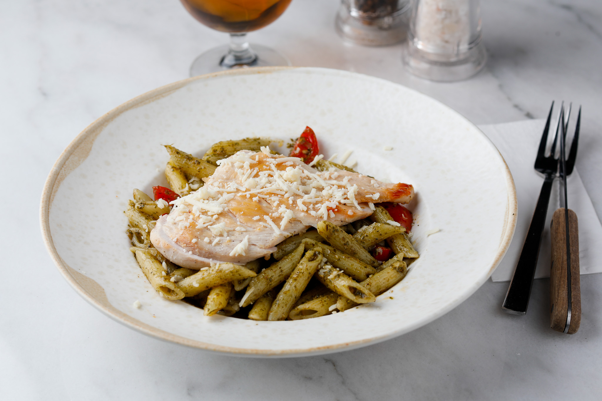 Pesto sos, Cherry domates, sarımsak ve tavuk bonfile dilimleri ile birlikte
