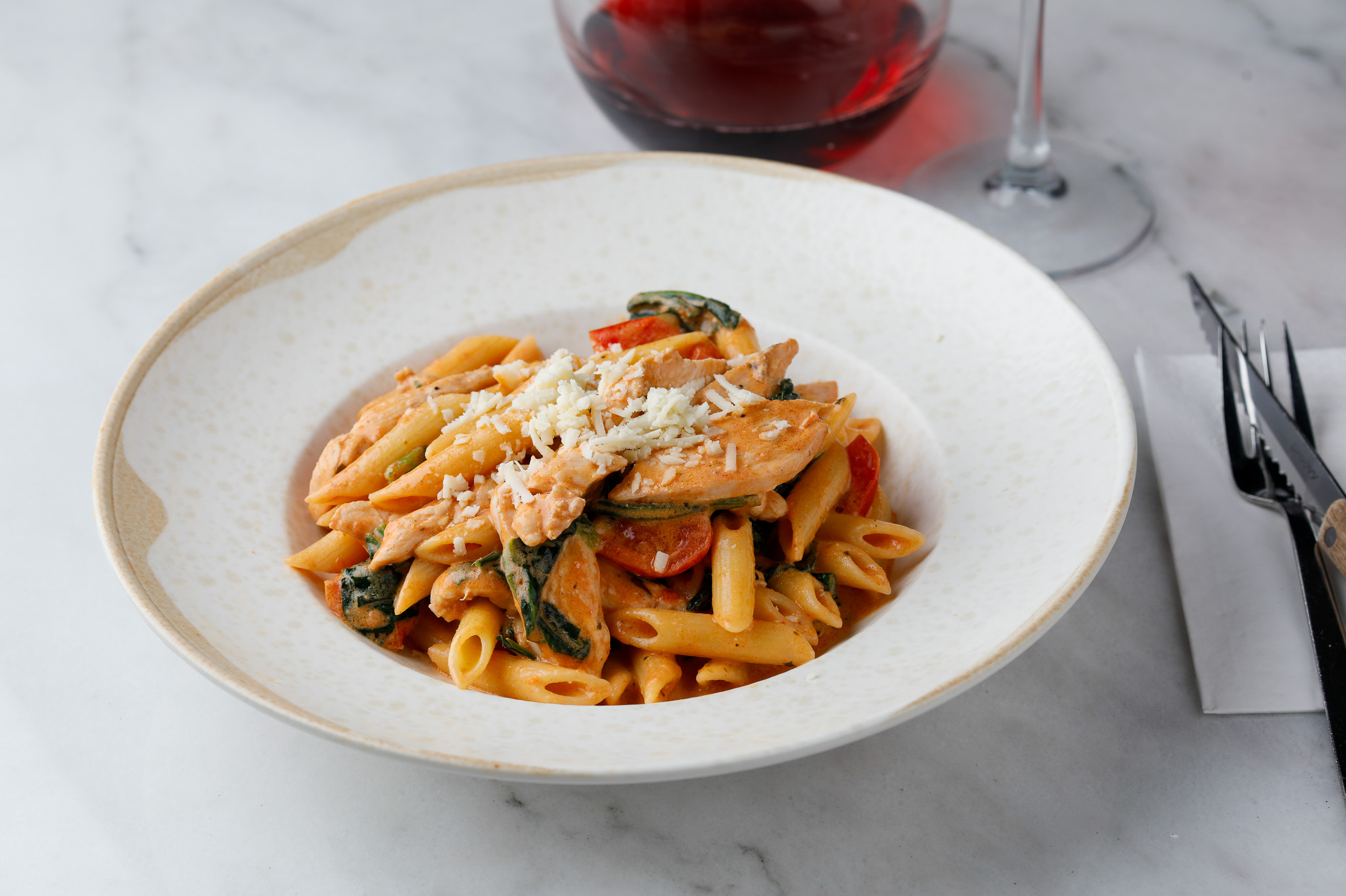 Soğan, peri peri baharat karışımı, Napolitan sos, tavuk göğüs dilimleri, krema, Cherry domates, ıspanak ve Mozzarella peyniri