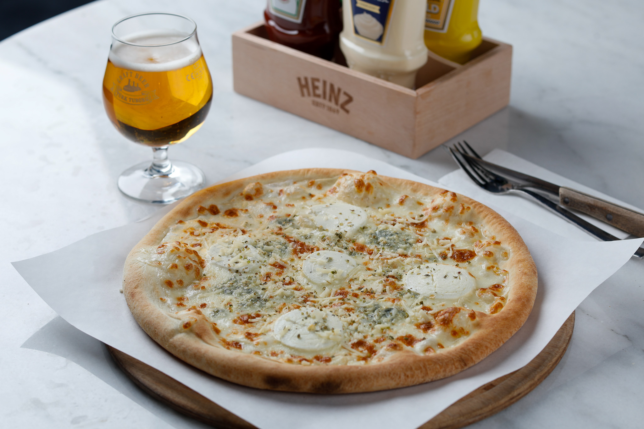 Pizza hamuru üzerine; krema, mozzarella, rokfor peyniri, Parmesan peyniri, keçi peyniri ve kuru kekik