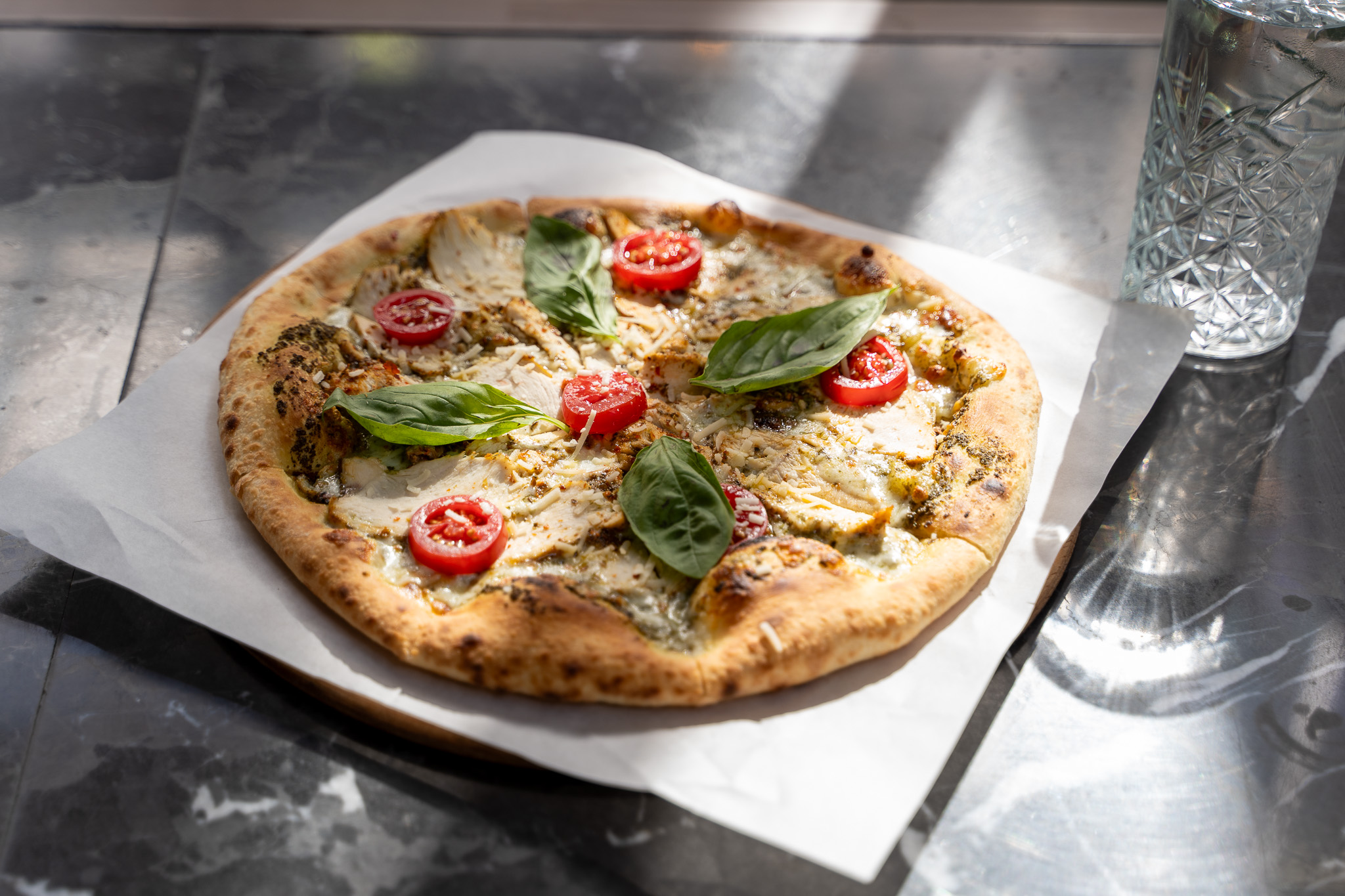 Pizza hamuru üzerine; pesto sosu, Mozzarella, Cherry domates, fesleğen, tavuk göğüs dilimleri, ceviz ve Parmesan peyniri