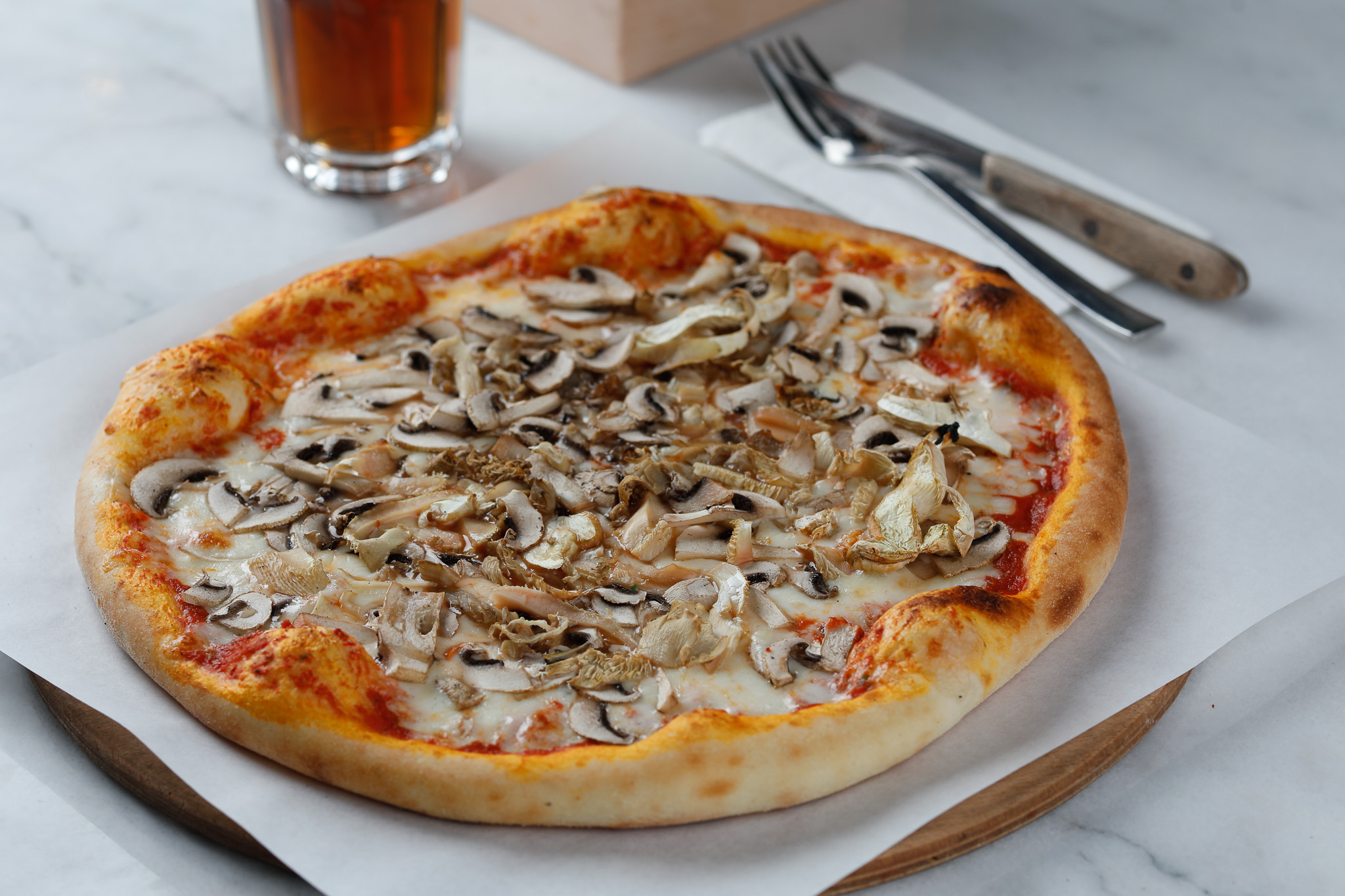 Pizza hamuru üzerine; pizza sosu, Mozzarella, mantar ve istiridye mantarı