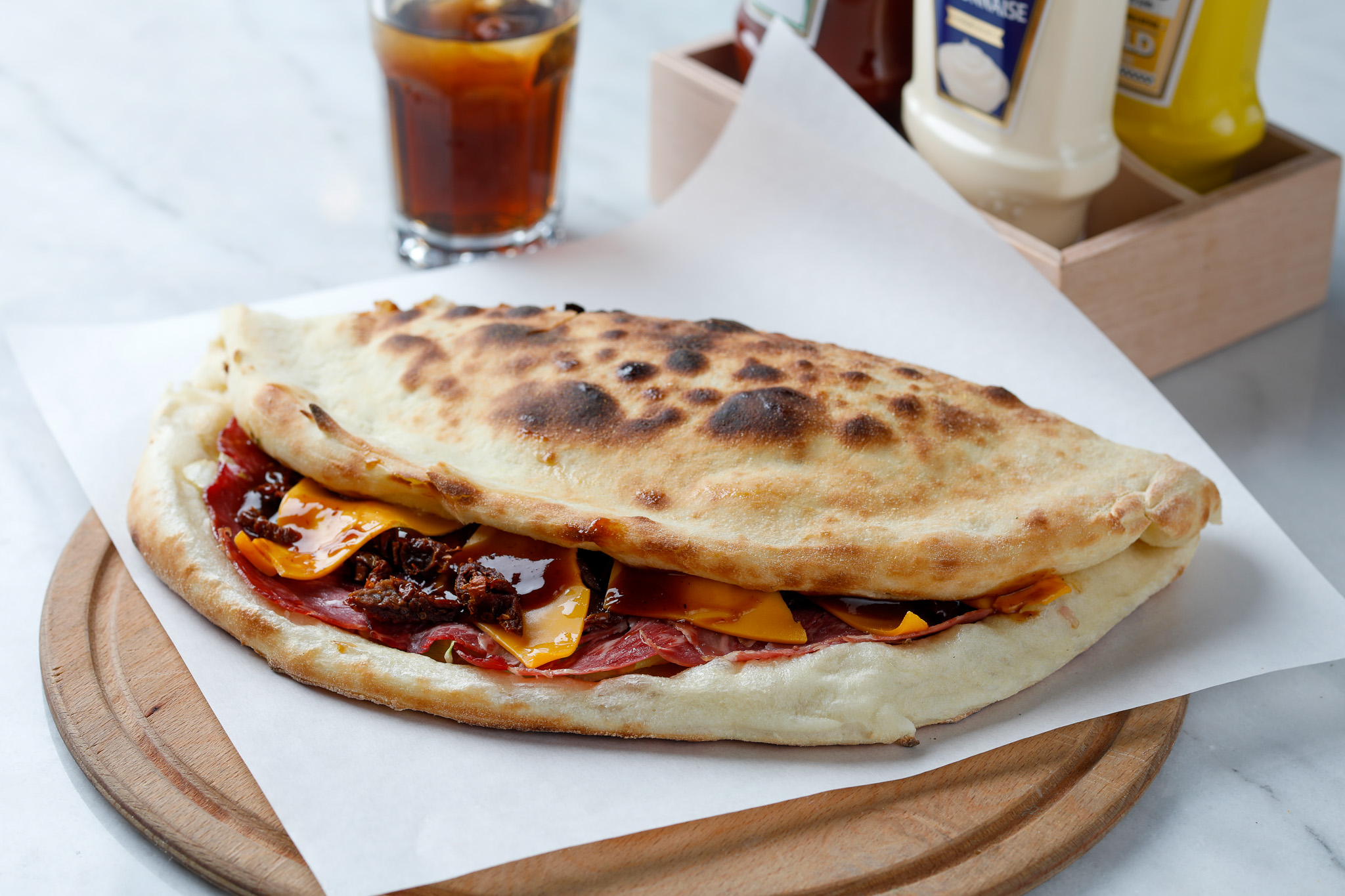 Taze pizza hamur ile yapılan sıcak ekmek içerisine; füme kaburga dilimleri, cheddar peyniri, iceberg marul, kurutulmuş domates ve BBQ sos