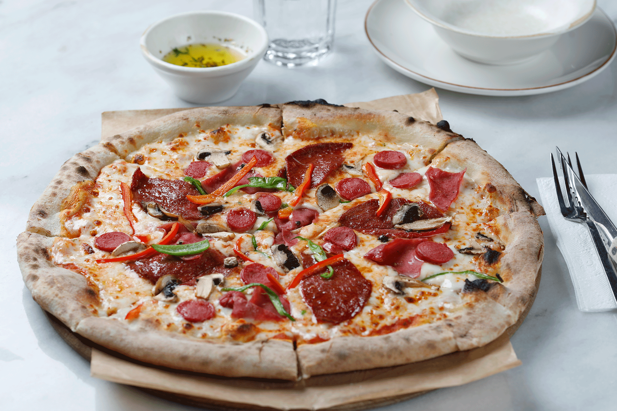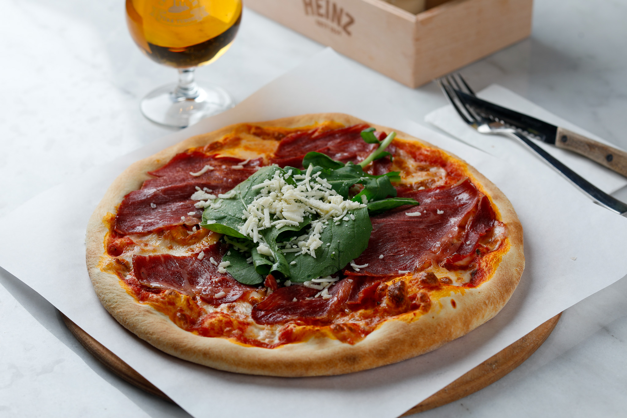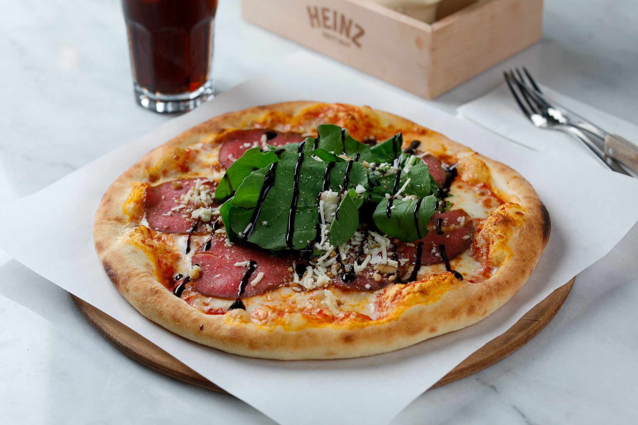 Pizza hamuru üzerine; pizza sosu , Mozzarella, dana Carpaccio dilimleri, roka, Parmesan peyniri, ceviz ve balzamik çektirmesi