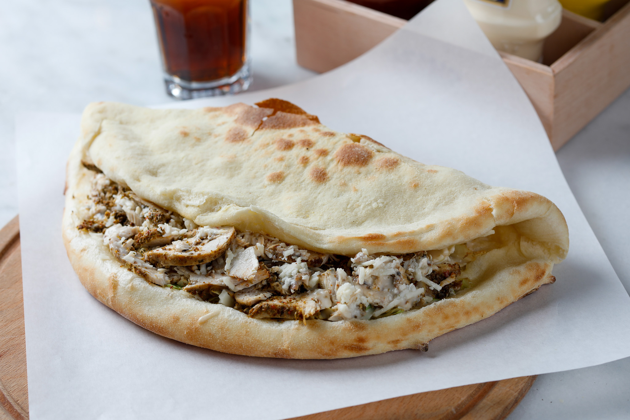 Taze pizza hamuru ile yapılan sıcak ekmek içerisine; tavuk göğüs, iceberg marul, sezar sos ve bolca Parmesan peyniri