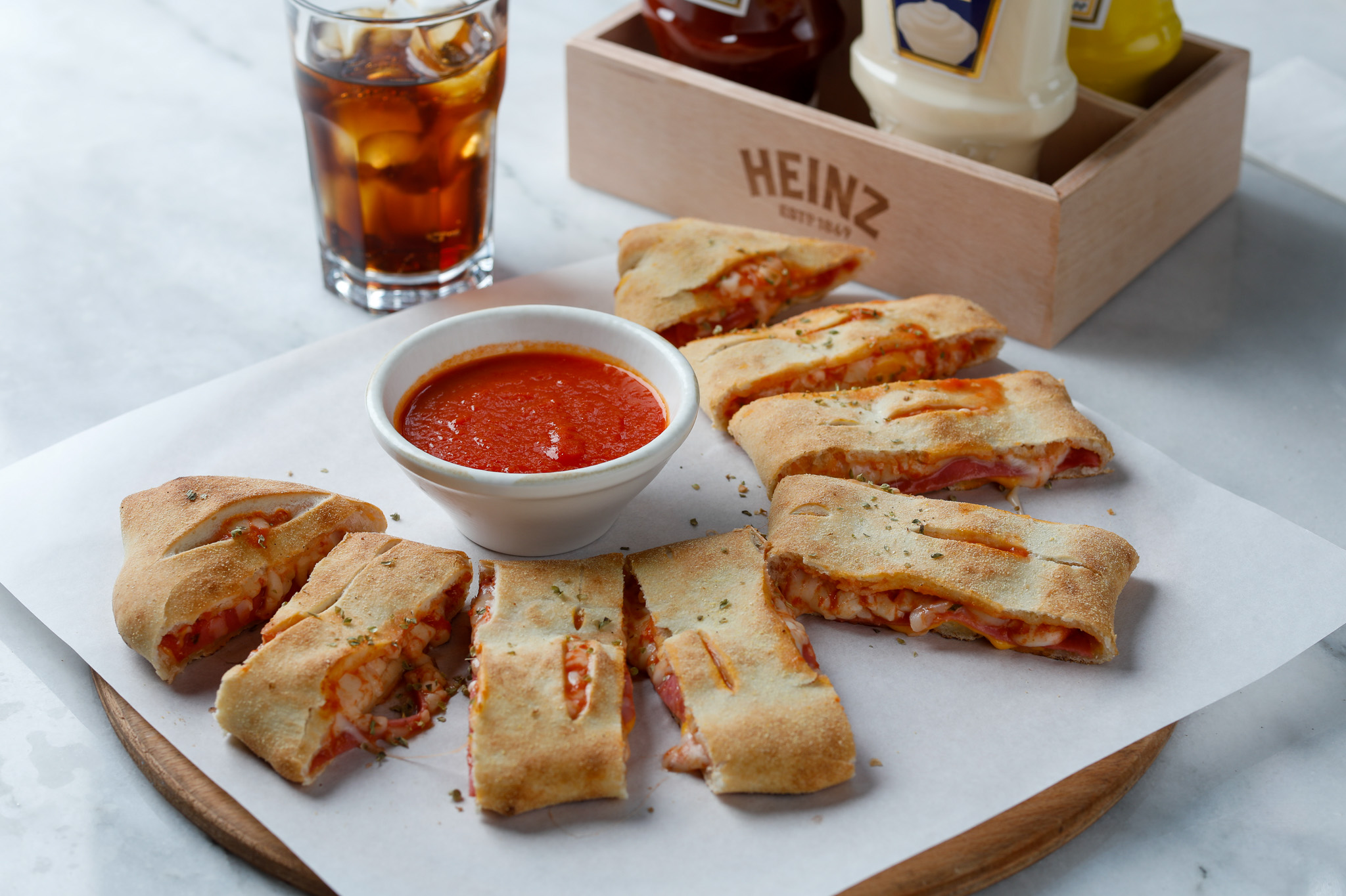 Jambonlu Cheddar peynirli, Mozzarellalı, pizza çöreği yanında Marinara sos ile birlikte