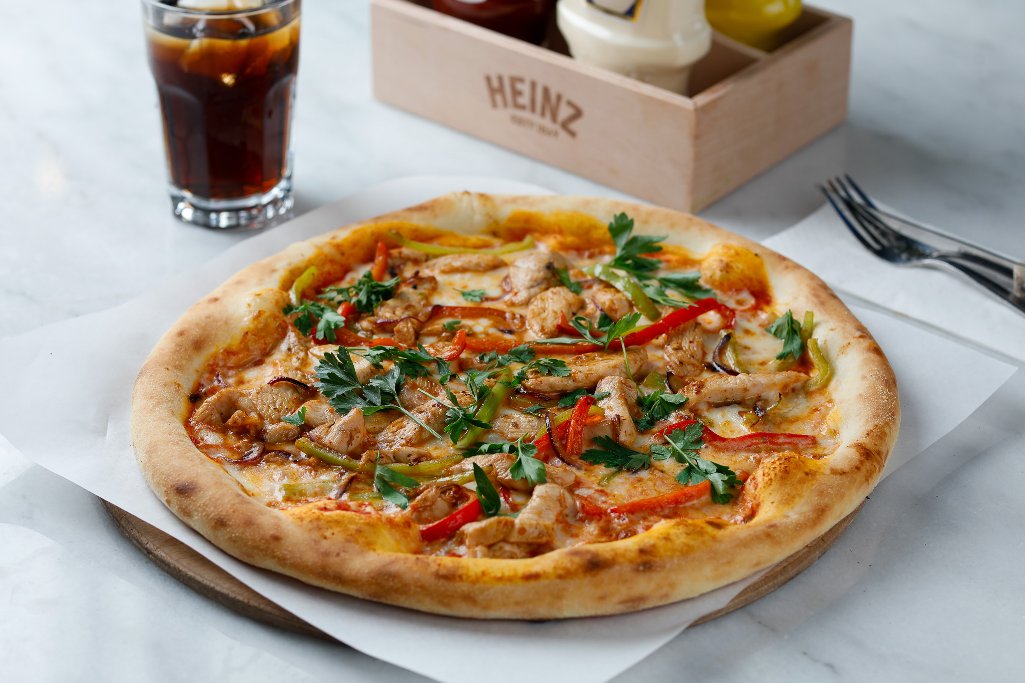 Pizza hamuru üzerine; krema, Mozzarella, tavuk göğüs dilimleri, yağ biberi, çarliston biberi, soğan, sarımsak, Chipotle sos ve maydanoz